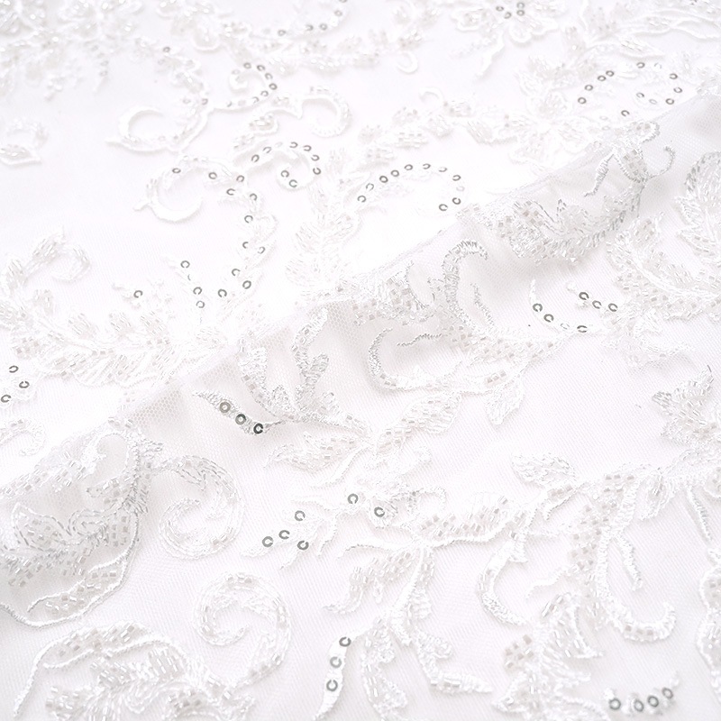 スパンコールと透明なビーズが刺繍された花とツタ柄のレースです。 両耳スカラップになっています。 耳のデザインは左右で異なります。ご利用の際は左右上下にご注意ください。 ※モチーフ単位でのカットは行っておりません。 |