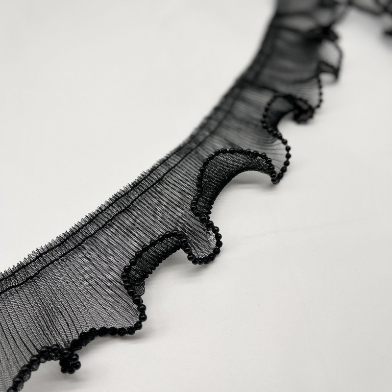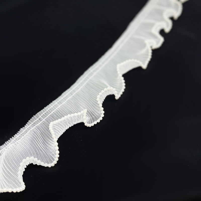 | 詳細 | プリーツを寄せたチュールのフリルレースです。 端にはパールが縫い付けられ、上品な雰囲気です。 また、フリル部分はチュールのため、切れ端がほつれずパールも取れないのでとっても使いやすい! 衣装や洋服だけでなく、インテリアにもおすすめです。 |