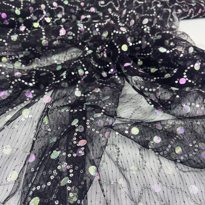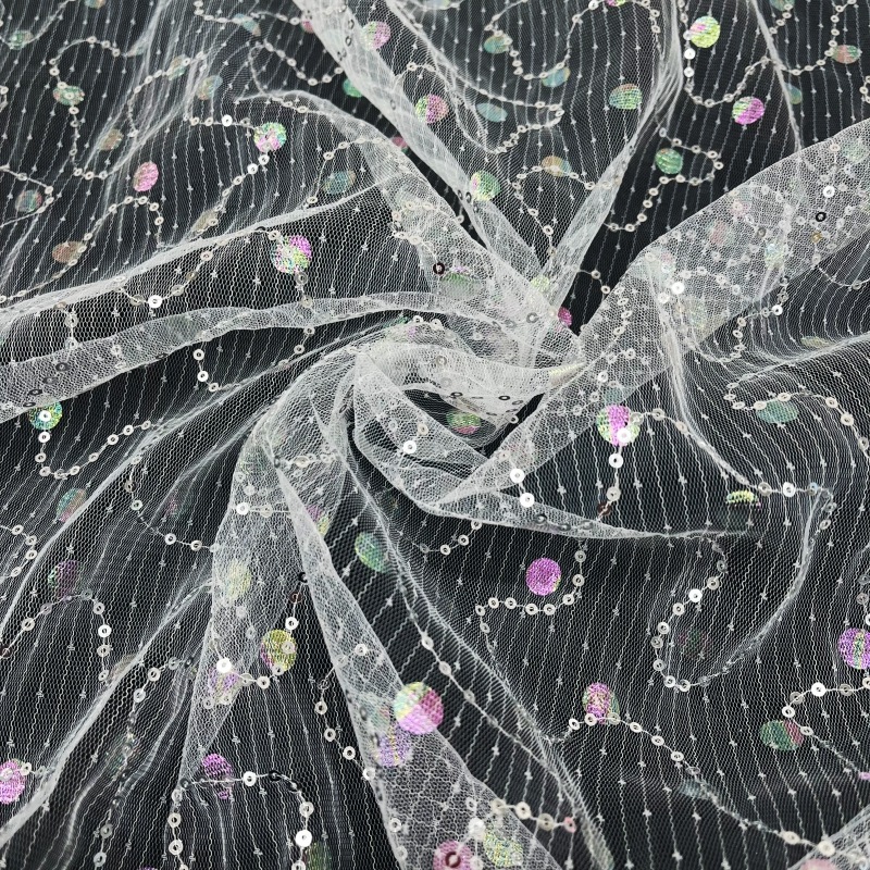 スパンコールとオーロラの箔がついた可愛らしいチュールです。 ランダムに縫い付けられたスパンコールがキラキラと光を反射するので、舞台などの衣装にもおすすめです。 丸く切られたオーロラの箔は角度により色の見え方が変わるので、360度全体どの角度で見ても楽しめる生地です。 |