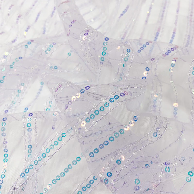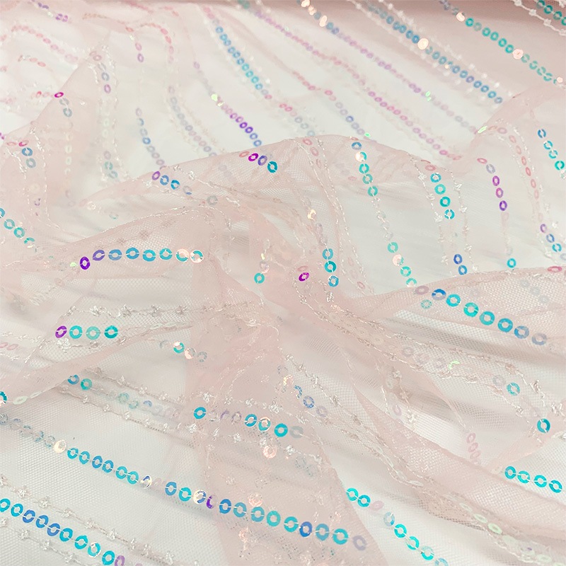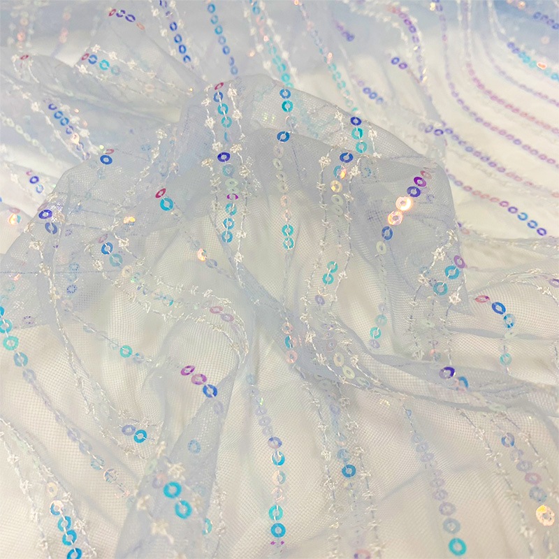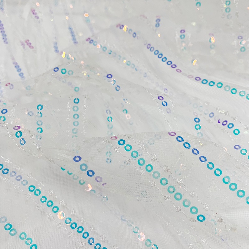 淡いカラーのチュールに透明オーロラのスパンと刺繍を施した ストライプ柄のチュールレースです。 1枚だと色の違いが判らないほどのパステルカラーだけど ギャザーを寄せたり重ねたりすることで色が出てくる! 色は淡いけどオーロラスパンがキラキラ光る! ファンシーでメルヘン!とっても可愛い生地です! 衣装だけでなく小物やアクセサリーを作っても素敵!! |