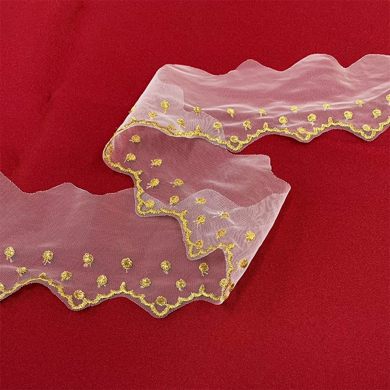 | 詳細 | 幅の広いチュールに金糸で刺繍をした可愛らしいレースです。 柄が小ぶりの為、ブラウスやワンピースの袖や裾に付けると可愛い印象になります。 ※刺繍部分に多少のほつれが入る場合がございます。 ご理解いただいた上でのご購入をお願い致します。 |
