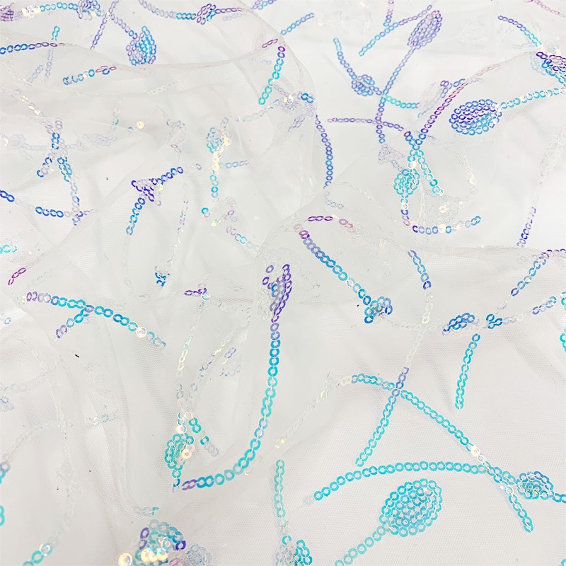 | 詳細 | 柔らかいチュール地に小さなスパンで植物のような模様を現した生地です。 軽くて柔らかく透け感もあるので繊細で可愛いイメージ。 透明オーロラスパンがキラキラと輝くので小物使いでも存在感あります。 |
