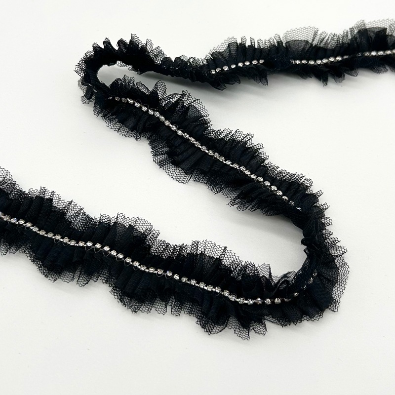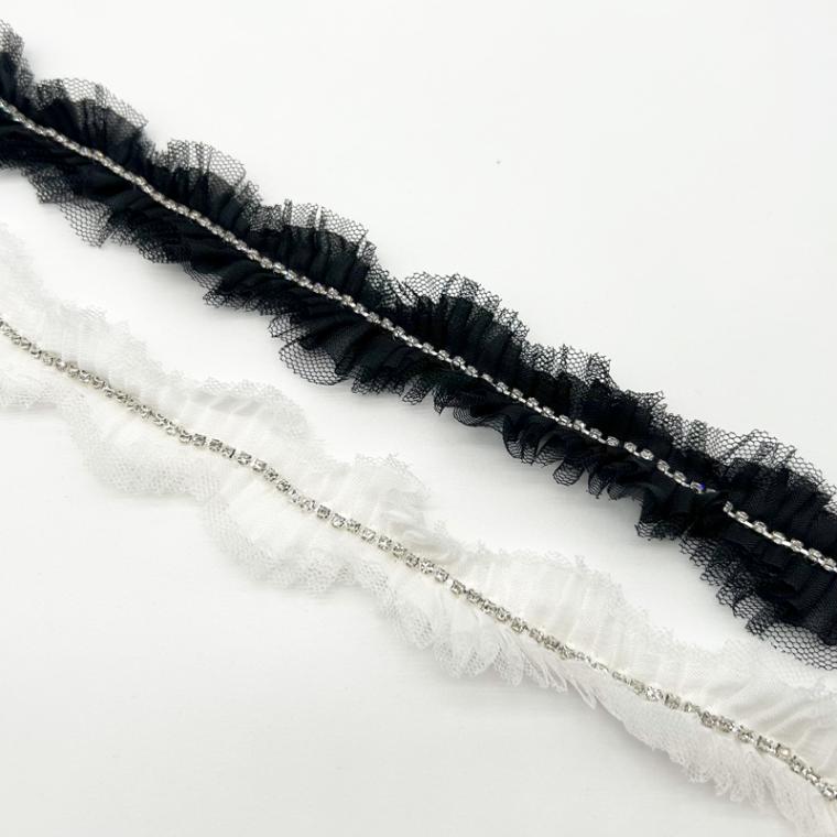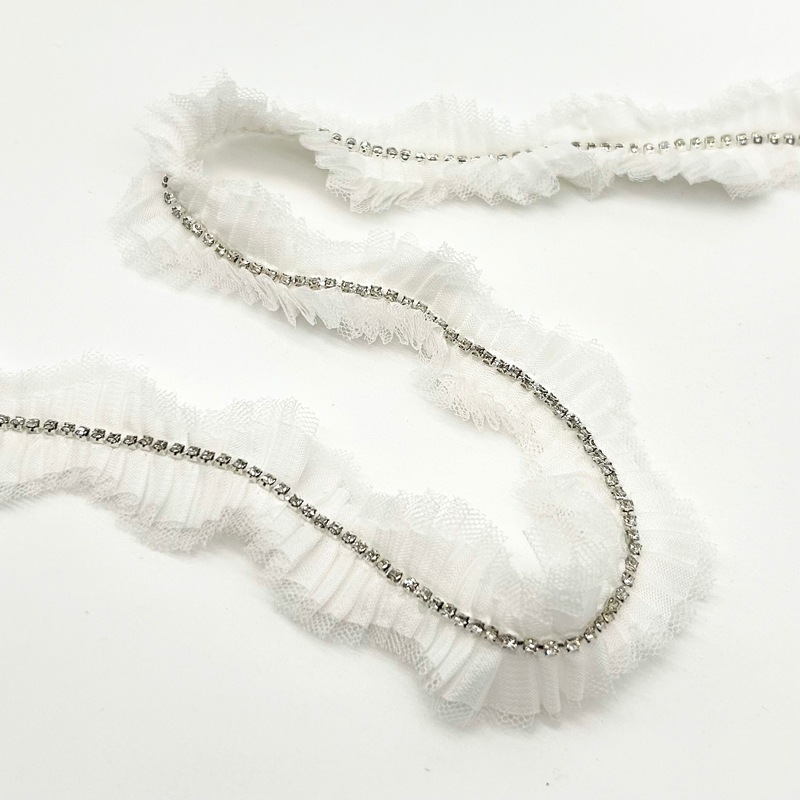 | 詳細 | 薄手のリボンとチュールをプリーツ状に重ねダイヤブレードを付けてます。 プリーツと波型になっていることでカーブ部分でも無理なく対応できます。 小さいながらキラキラと光を反射するダイヤブレードは存在感ありますよ♪ |