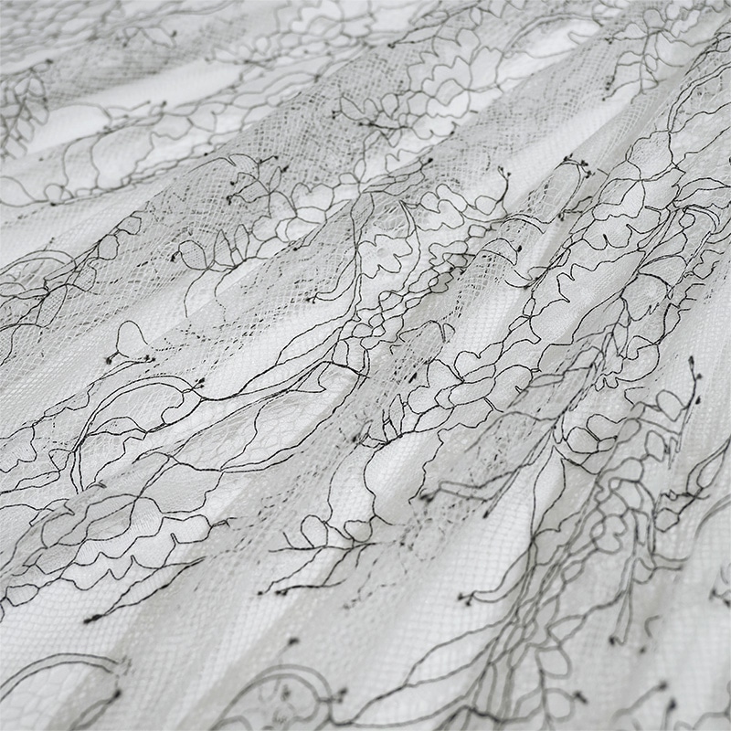 | 詳細 | 柔らかなレース生地です 花柄に細いブラックコードで縁どりをし、モノトーンで落ち着きがあり大人っぽい雰囲気です 薄くて柔らかく繊細 下に合わせる色で雰囲気が変わり楽しいです ※傷や糸ツレが入る場合がございます |